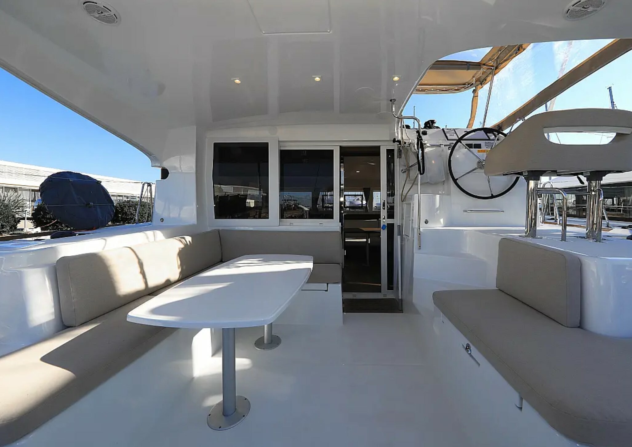 A comfortable cockpit looking out to sea: a starboard dining table, able to accommodate up to twelve guests, a recreation area on the same side and seating at the rear beam.