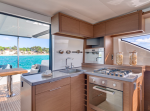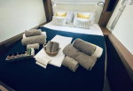 Volume and comfort in the hulls with particular attention to storage space is remarkable: cabins with Island bed berths forward and aft, large storage volumes, hanging lockers, and open bookcases.