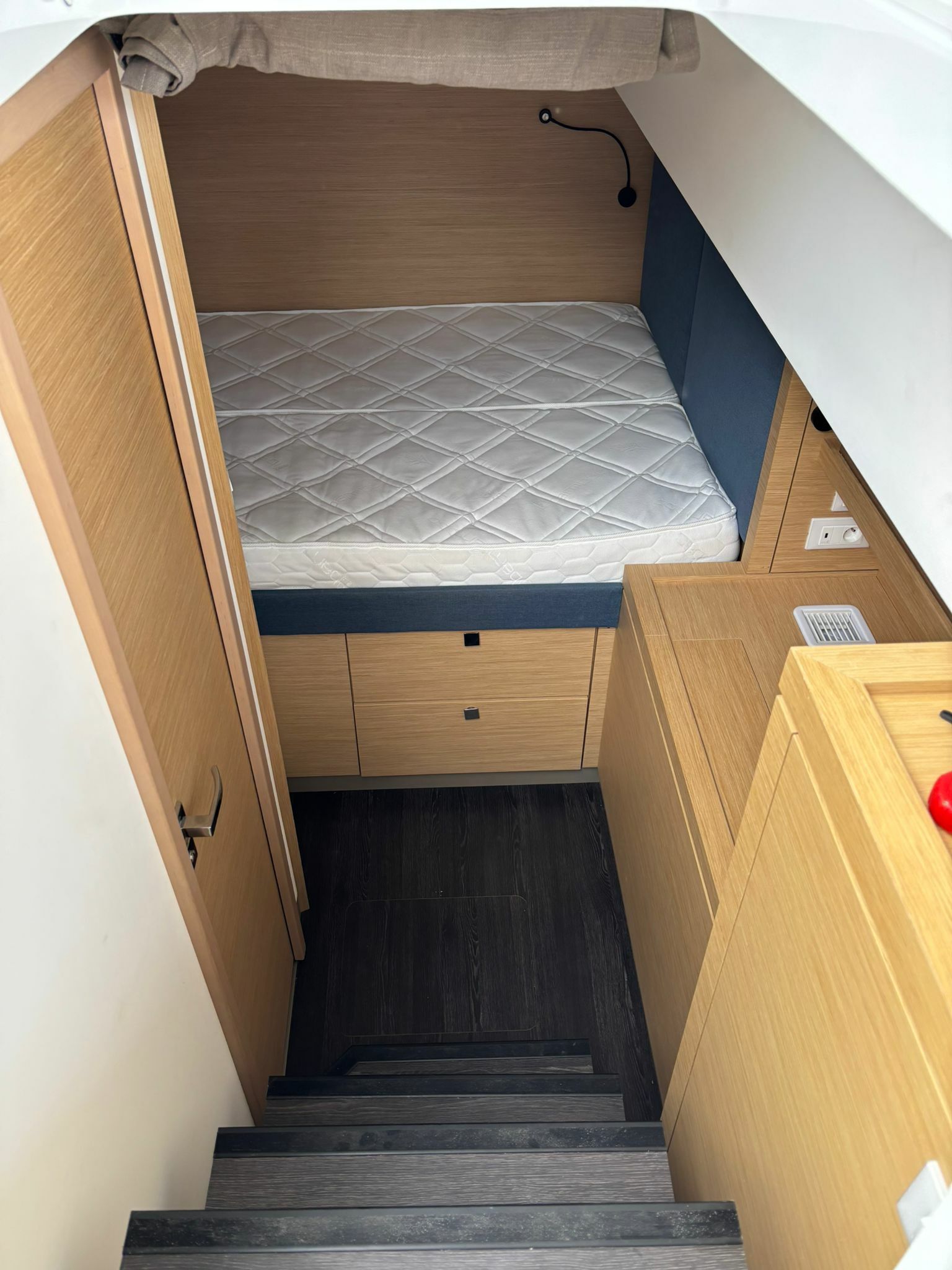 The four double cabins are spacious, bright, and well-ventilated, each featuring a head with a separate shower. An additional double cabin with bunk beds is located in the port hull, thus increasing this catamaran's accommodation capacity.