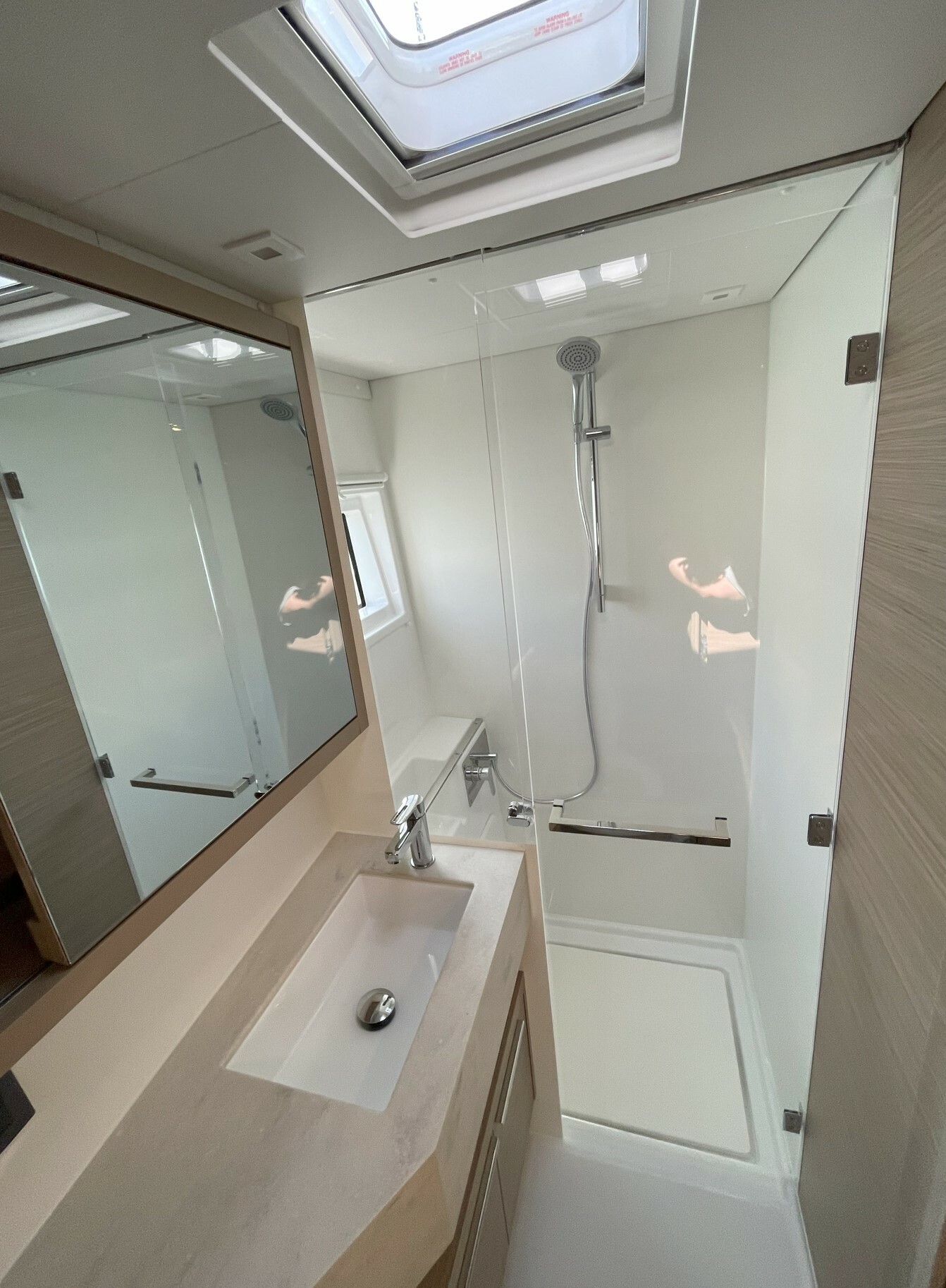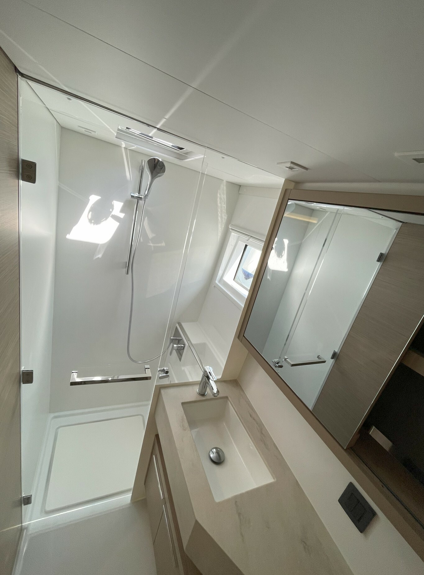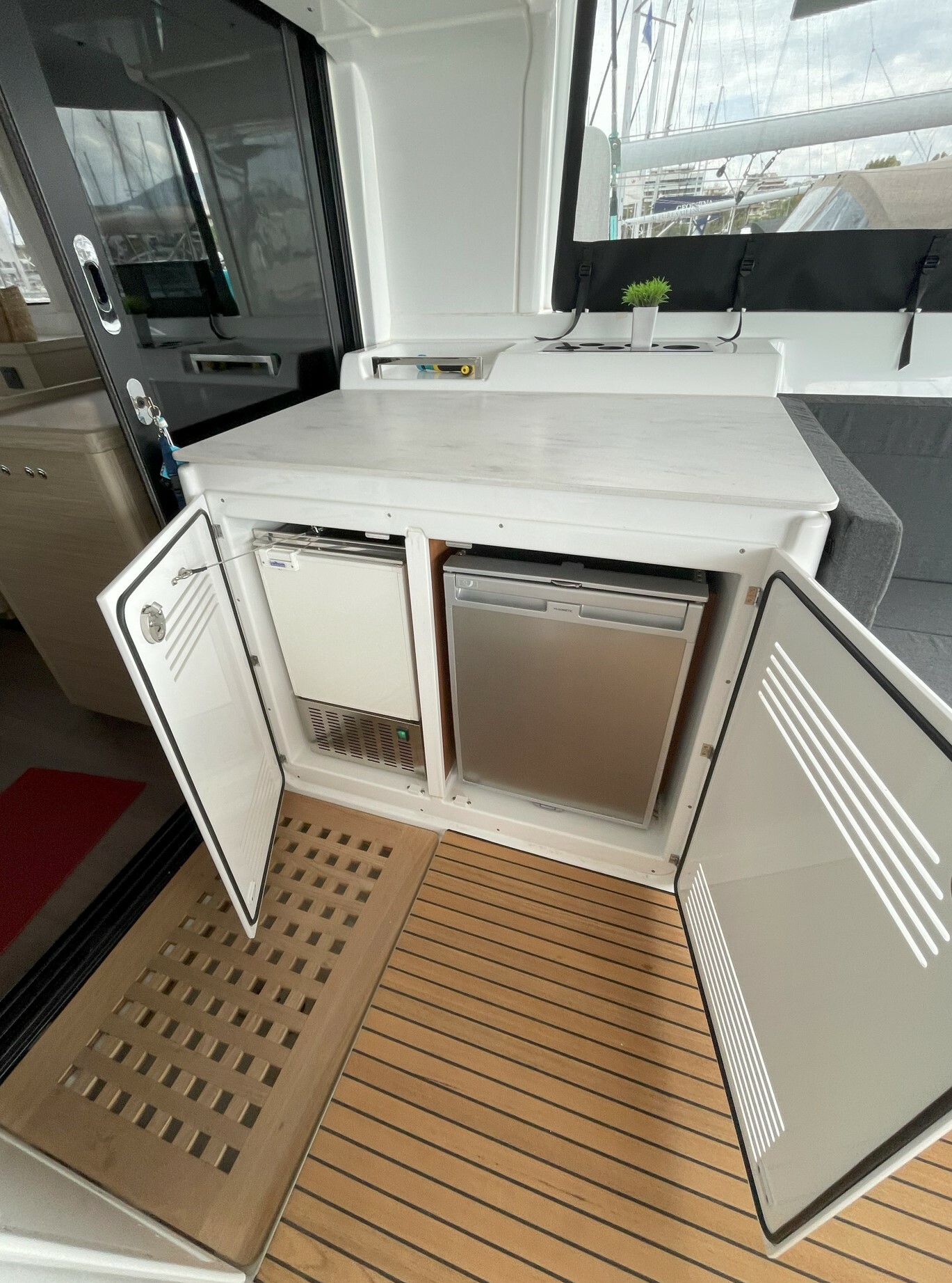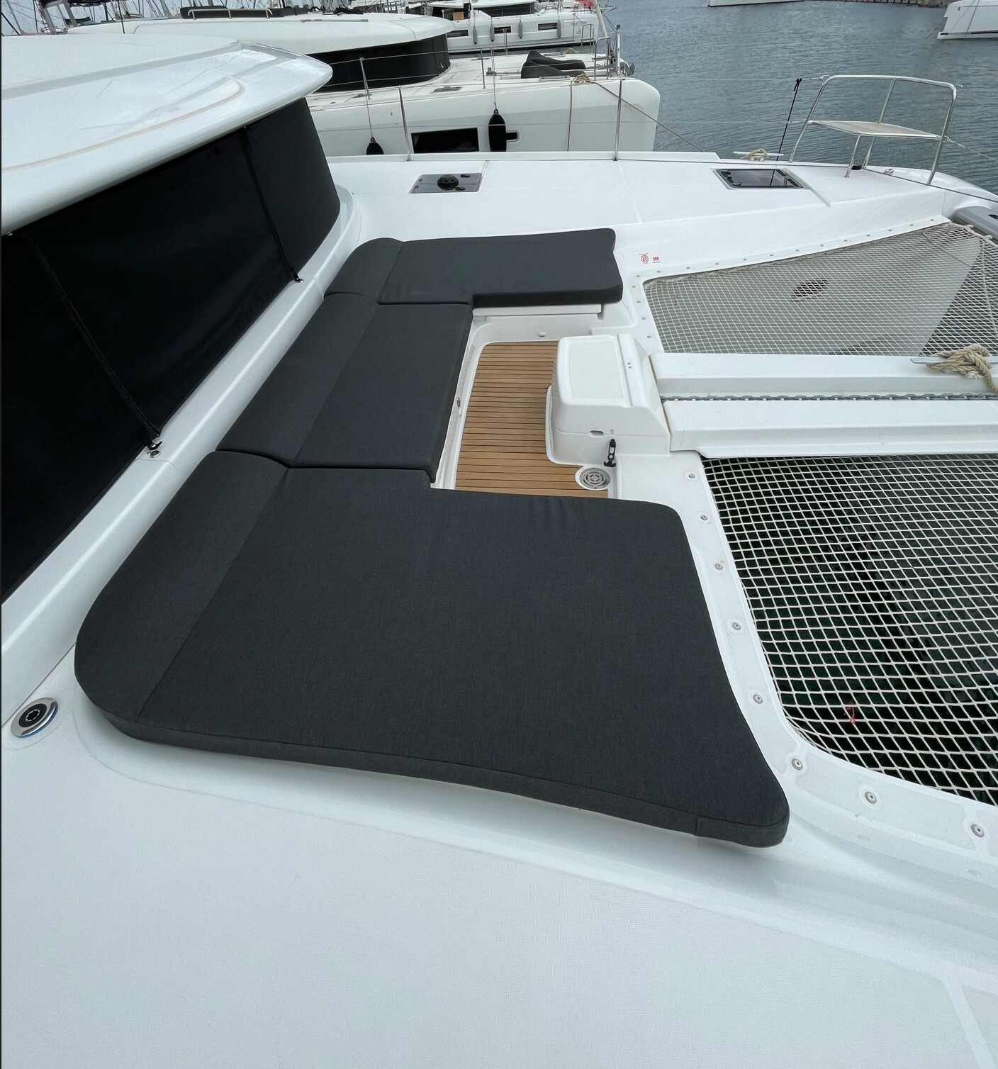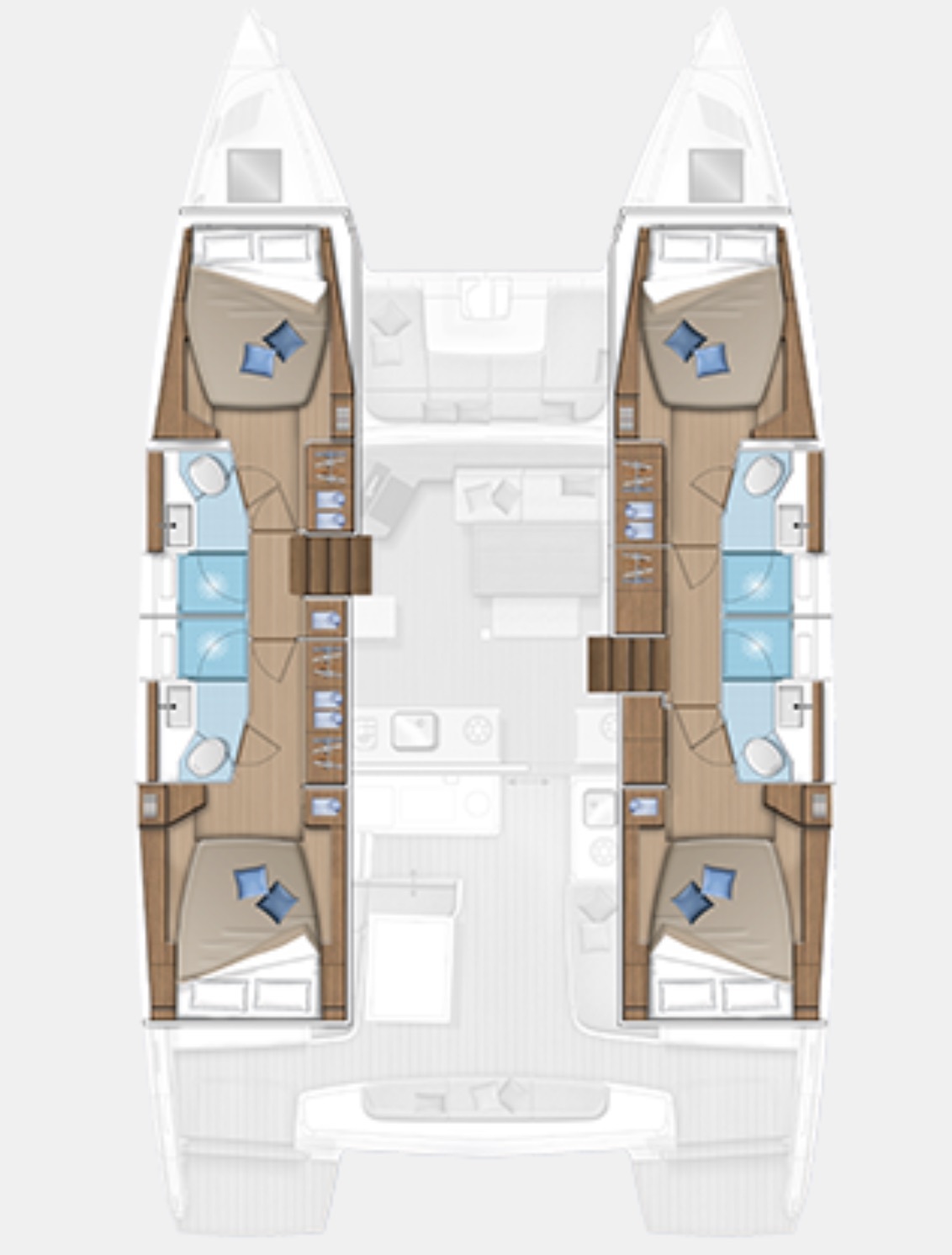 The new Lagoon 46 has all the credentials to be the new flagship model of the Lagoon shipyard from 2020. Just like the other models of the French company launched in recent years, the trend continues to increase comfort and practicality on the three levels available for guests on board (interiors and cabins, deck and flybridge) but with an increasing attention to the catamaran's sailing performance. In this sense the retraction towards the stern of the mast, compared to the Lagoon 450, and the consequent increase of 10 sqm of sail plan compared to its predecessor and the practical use of the fore sail thanks to the comfortable self-tacking jib. The distinctive feature of the new catamaran is undoubtedly the lengthening of the bimini towards the stern with the creation of a very comfortable sun deck / sitting area a on the fly immediately behind the command cockpit. It should be noted that the sitting area on the Fly can be fully covered by a folding sun deck and therefore it is very practical even when anchored. The cockpit is large and has a table that can accommodate up to twelve guests. Also the wide descents to the sea are very practical with wide steps and without border in the lower step that facilitate the ascent and descent from the tender. A further U-shaped saloon is located at the bow, an ideal place to enjoy sailing and aperitifs in the harbor and when anchored. The dinette is large and bright with the kitchen very well equipped and looking aft towards the cockpit. The table inside can be lowered to the level of the sofa to form an additional double bed. Finally, an absolute novelty compared to the previous models, a part of the front windows can be totally open, facilitating the passage of objects towards the bow and perfect aeration in the harbor. The cabins are large and very high with semi-island beds and exceptional natural lighting thanks to new and larger windows