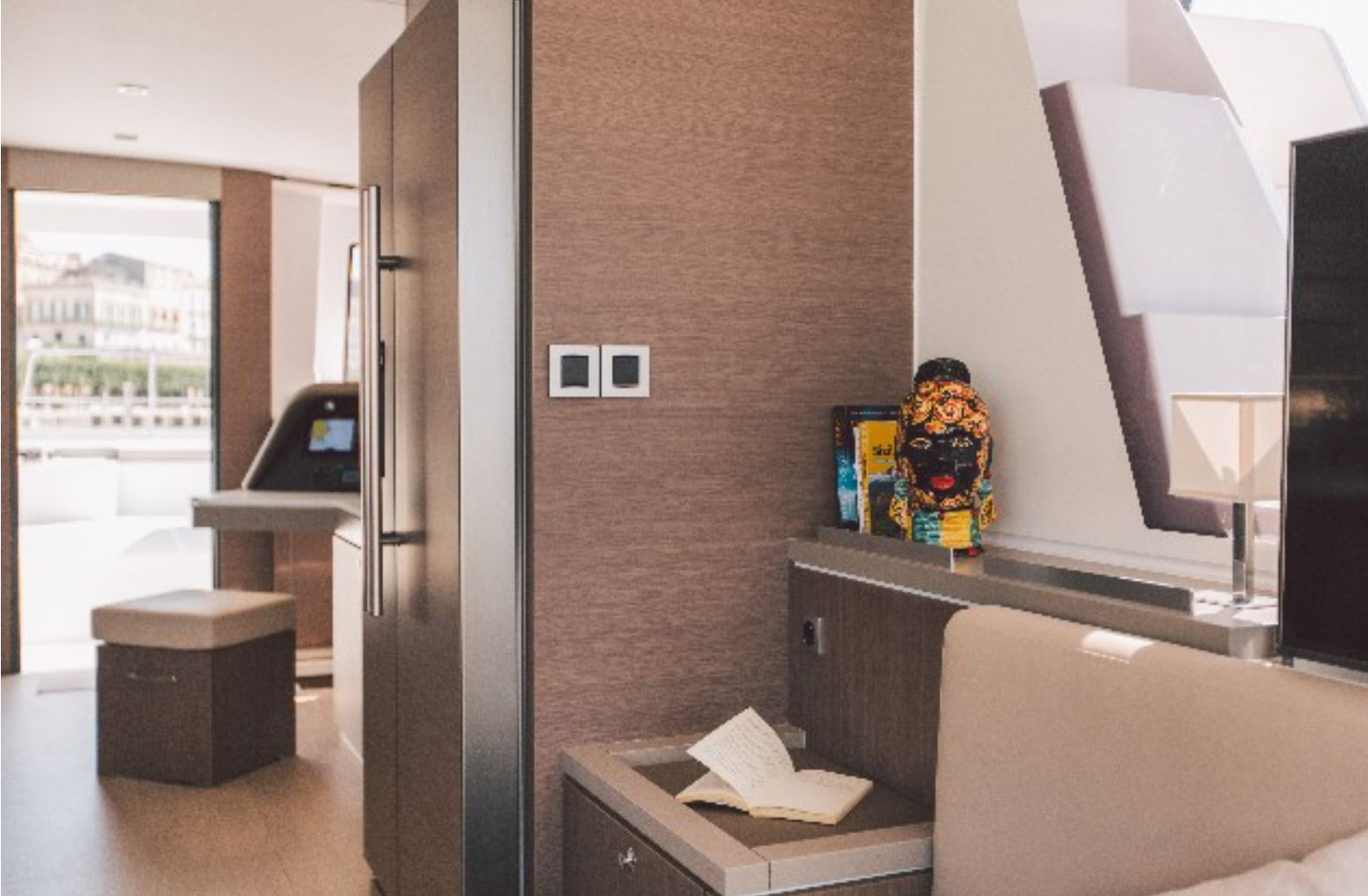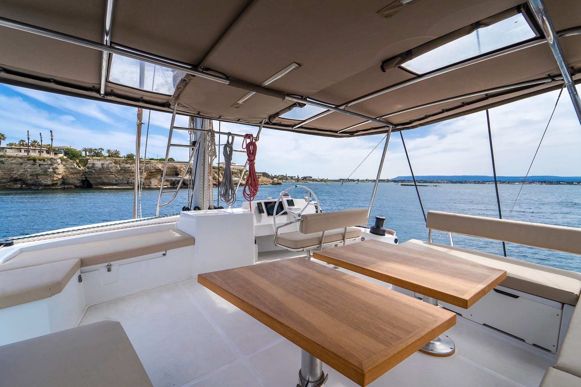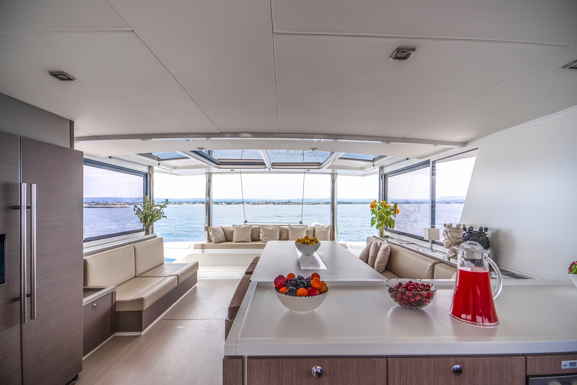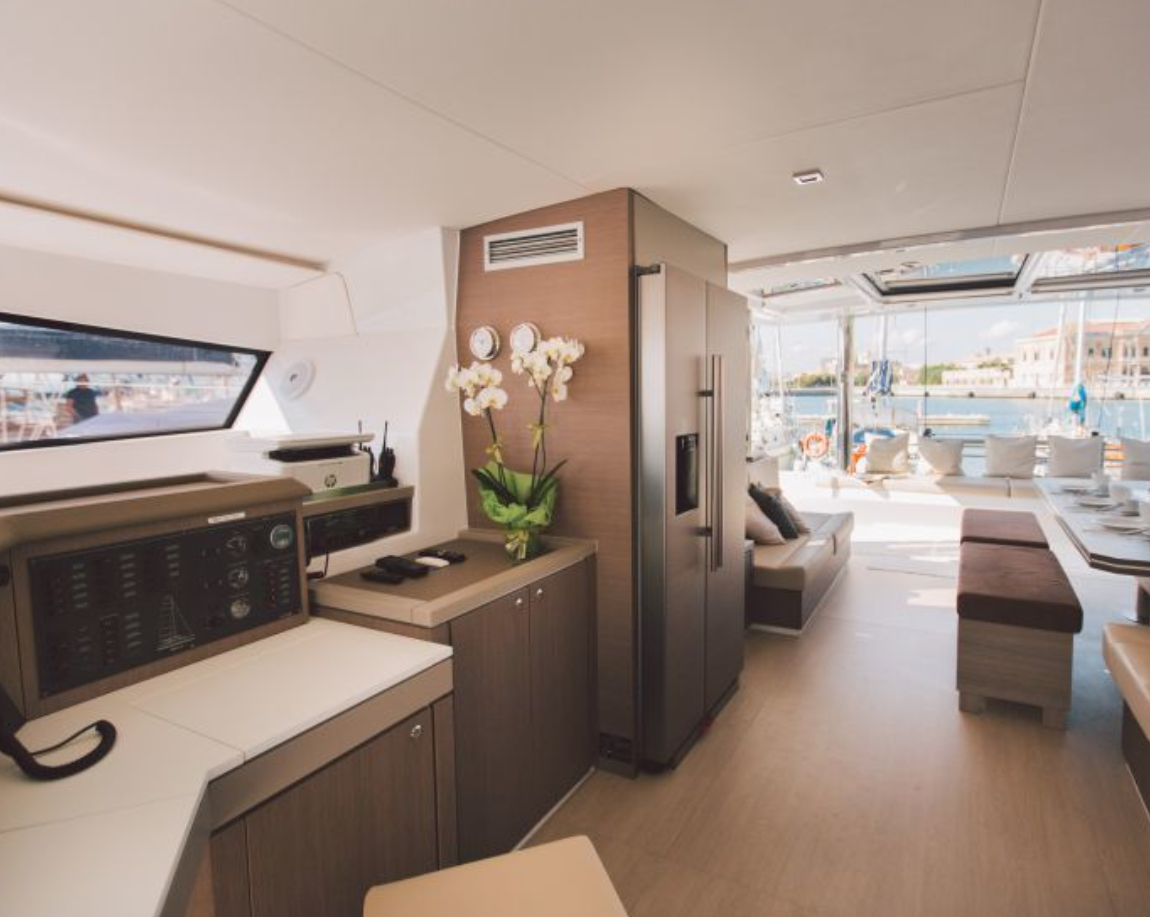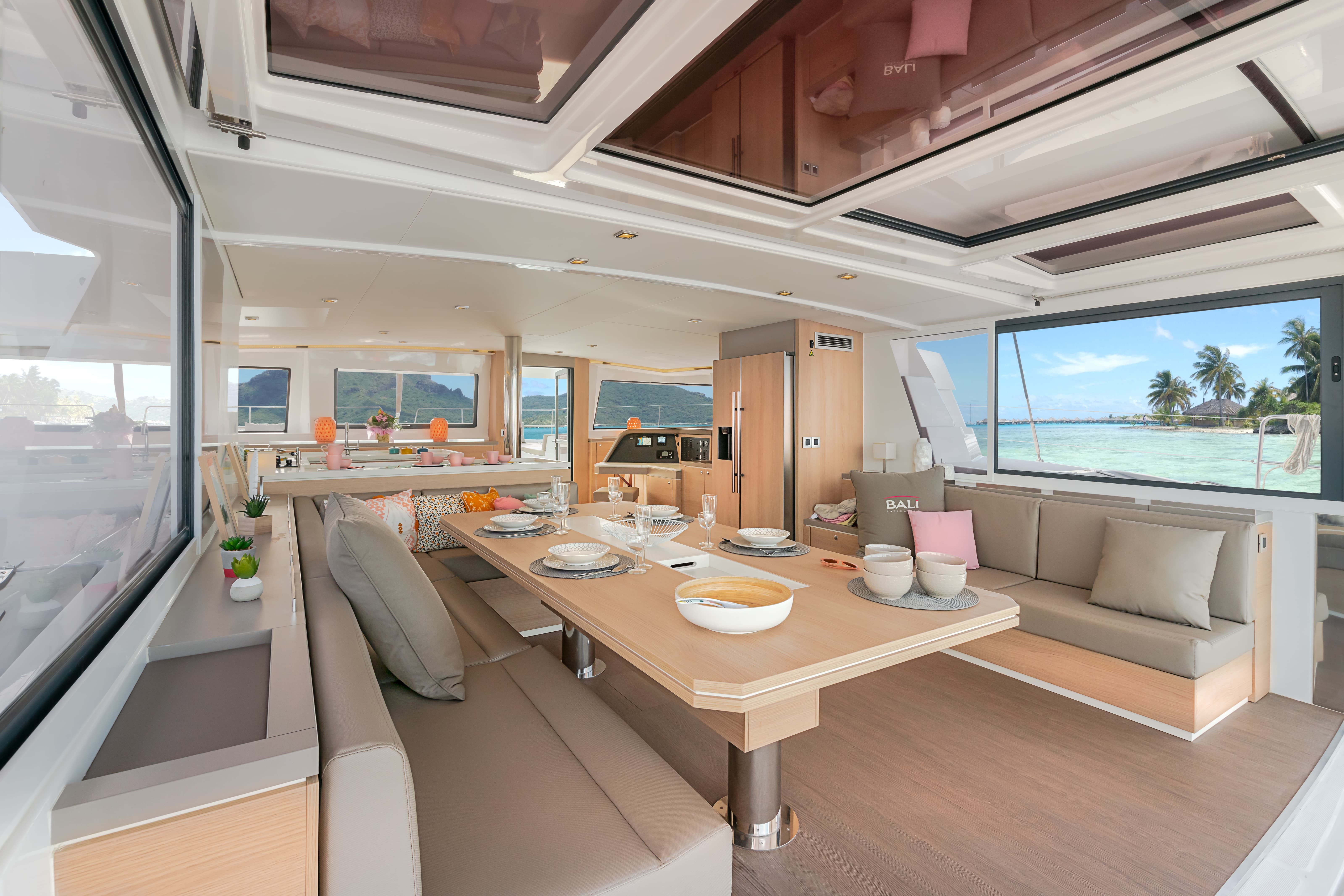 The BALI 5.4 Open Space is characterized by completely open spaces and very ergonomic living spaces. In addition to the recognized innovations such as the rigid front cockpit with lounge area and sunbathing, the new platform linking the two rear skirts with large bench and chests, the large tilt-and-turn door and sliding windows, a panoramic relaxation area on the roof, the BALI 5.4 offers new access to the front cockpit through an interior door and cabins through panels opening onto the rear cockpit.