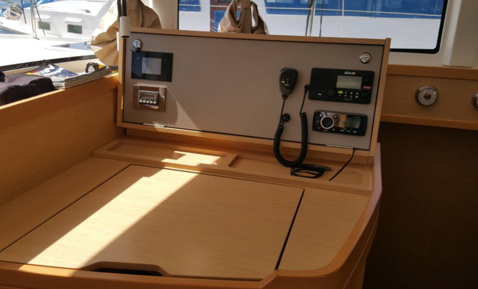 La timoneria è stata posizionata in posizione rialzata rispetto al cockpit e ben protetta da un bimini rigido. Lo skipper è cosi facilitato nelle manovre con equipaggio ridotto e può timonare da una posizione molto più protetta rispetto a quella su fly. Dalla timoneria è possibile gestire tutte le manovre, incluso le virate che sono estremamente veloci ed efficaci per la presenza del fiocco autovirante.