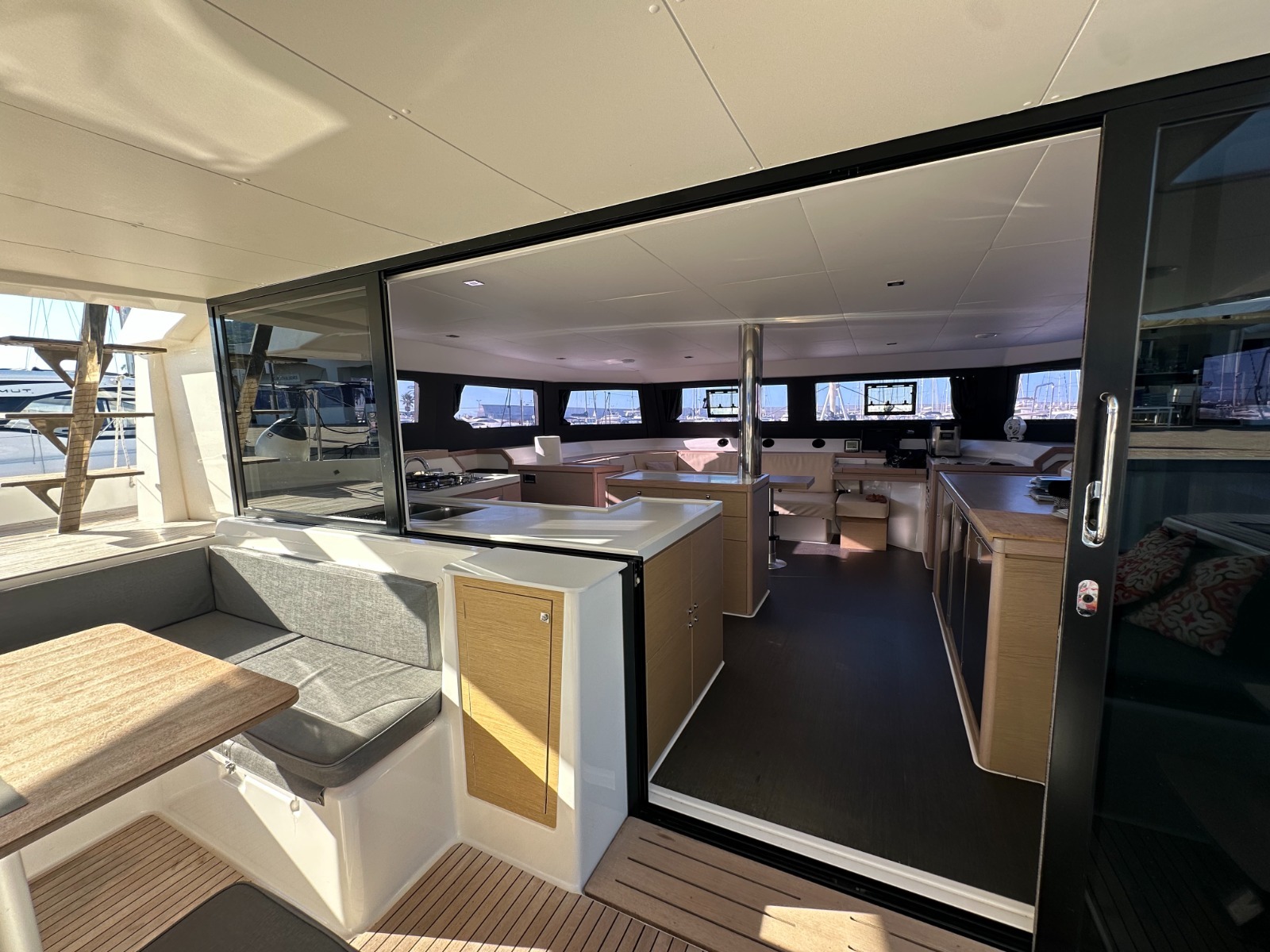 Il Dufour 48 è completamente equipaggiato con tutte le attrezzature charter ed è inoltre dotato di un fiocco autovirante e di un comodo winch elettrico. Il salone è completamente attrezzato con aria condizionata, generatore e servizi igienici elettrici come anche tutte le cabine. Tutto lo yacht è collegato con un supporto audio al lettore CD / MP3 della radio Bluetooth Fusion. La cucina è completamente attrezzata con lavastoviglie e tutte le attrezzature necessarie per il noleggio. Il nostro catamarano ha un grande tender per tutte le esigenze ed è integrato nella struttura del catamarano, la piattaforma elettrica sarà l'ideale per lanciare un gommone in sicurezza, ma sarà anche apprezzato come una spiaggia privata estesa sul livello del mare.
