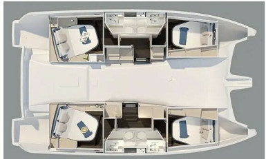Il layout interno privilegia lo spazio e la privacy con 4 cabine matrimoniali tutte servite da toilette privata. Gli interni sono luminosi e ariosi grazie alle ampie finestrature e alle tonalità chiare dei materiali di pregio.