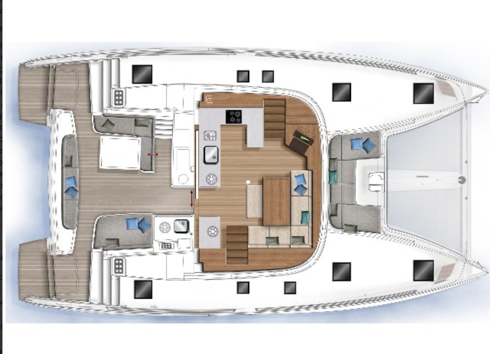 Segno distintivo del nuovo catamarano è sicuramente l’allungamento del bimini verso poppa con la creazione di un comodissimo prendisole/salottino a sul fly immediatamente dietro della postazione di comando. Da notare che il salottino sul Fly può essere coperto a sua volta da un prendisole abbattibile e quindi risulta molto fruibile anche quando ancorati in rada.